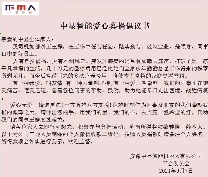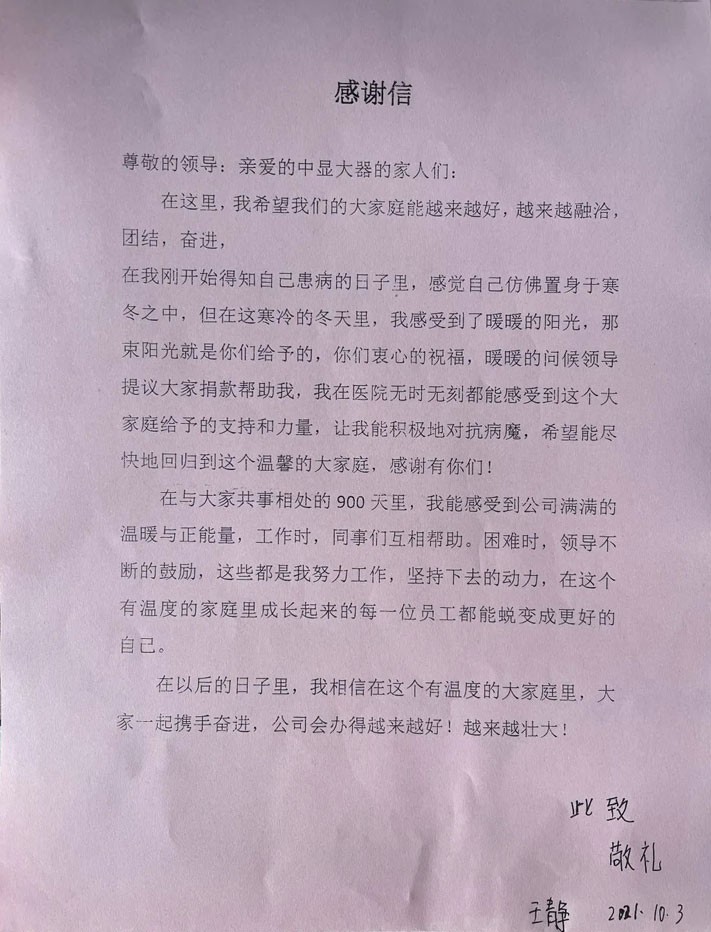 看望后,王靜對大家的關(guān)心表示真誠的感謝,并表示會積極接受治療,爭取早日康復(fù),回歸溫暖大家庭,與大家攜手奮進。