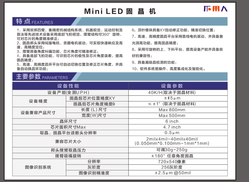 為滿足市場需求,配合目前最新的面板技術——Mini LED 背光技術的發展,中顯智能研發團隊歷經半年多時間,成功研發制造出第一臺Mini LED 固晶機,本臺設備具有高速、高精度、高效率和高穩定性的特點,實現Mini LED芯片巨量轉移,并實現轉移過程的不良、缺陷檢測等。