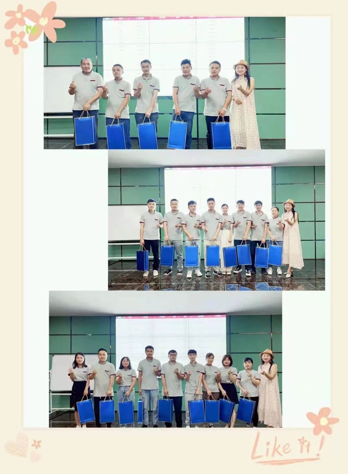 最后,在主持人的宣讀下,入職三年以上的員工紛紛上臺,接受趙總頒發公司精心準備的三周年紀念品,并合影留念。